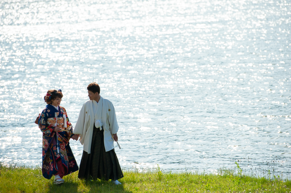 お二人の「大好き」が伝わってくる、幸せなロケーションでした。善光寺門前はちょっとレトロで素敵な場所がたくさん。いつものデートのように街を歩くだけで、素敵な写真になりました!ご自分のお振袖に白無垢を合わせた青木写真館オリジナルコーディネートです。